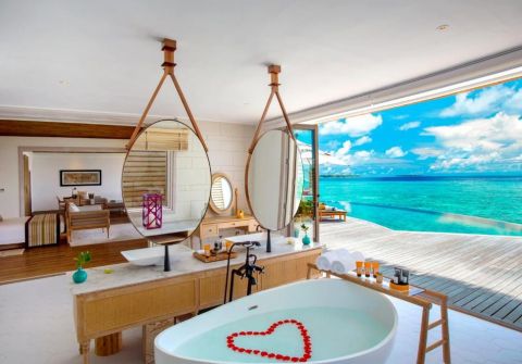 Milaidhoo Ocean Residence (564 м²) е вила над водата с две спални, отделна всекидневна, частен инфинити басейн, фитнес, директен достъп до лагуната и личен иконом, отличена със златни награди за устойчивост и технологии за 2024 г.